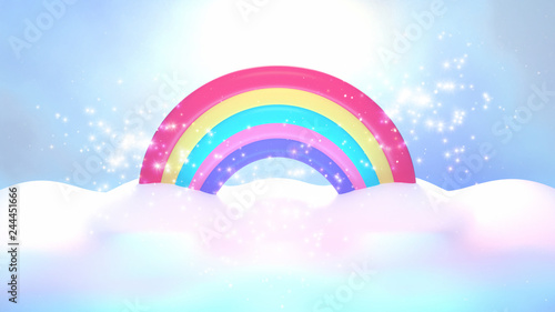Cartoon rainbow and clouds with shiny magic sparkles effects. 3d rendering picture.