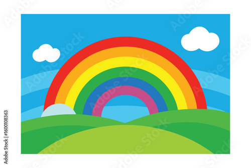 cartoon, rainbow, over, green, hill, fluffy, landscape, sky, weather, storm, after, rain, colours, bright, vibrant, peaceful, calm, beautiful, serene, joy, happy, fun, vector, art, graphic, design, illustration, scene