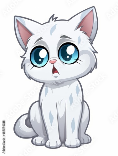 Cartoon sticker white hungry kitten on white background isolated, AI