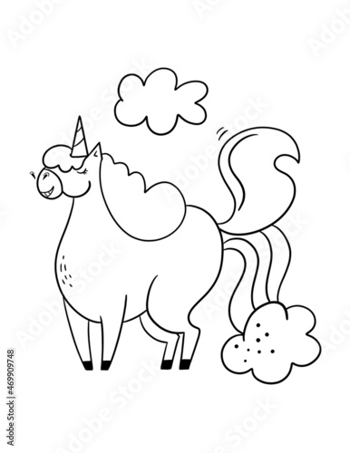Cartoon style illustration with unicorn pooping rainbow. Funny coloring page for kids.