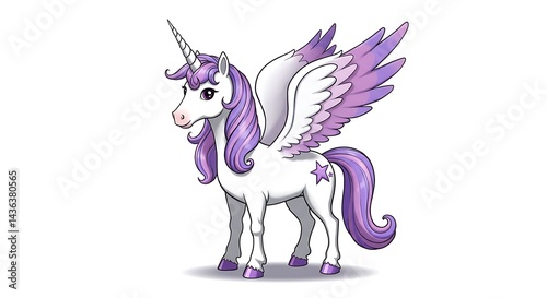 unicorn, standing, cartoon, animal, white, purple, wing, illustration, fantasy, magic, myth, horn, mane, tail, character, drawing, graphic, design, artwork, art, clip art, isolated, background, cute, pony, fast horse, creature, horse, mythical, fairy tale, legend, icon, symbol, vector, equine, children, children, dream, star, pegasus, flying, equestrian, positive, joy, playful, cheerful, imagination, artistic, story