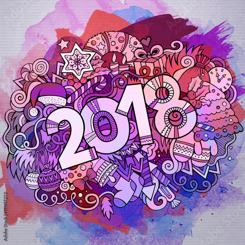 2018, abstract, ball, bell, cartoon, celebration, christmas tree, congratulation, date, december, decoration, design element, emblem, firecracker, font, fun, garland, gift, greeting card, hand-drawn, happy new year, holiday, illustration, jan, lettering, line art, logotype, merry christmas, object, postcard, present, santa, sock, sweet, text, tinsel, toy, type, typographic, winter, word, christmas, artistic, painting, watercolor