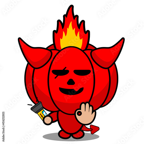 cartoon vector illustration of cute red devil pumpkin mascot character holding flashlight