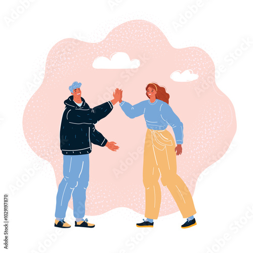 Cartoon vector illustration of interaction people in team. Good job concept. Man and woman give each other five