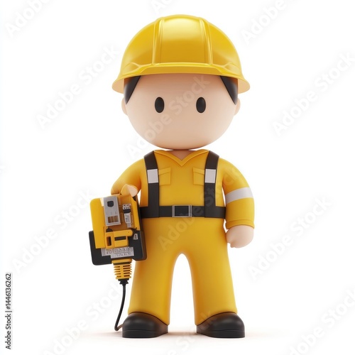three-dimensional, sticker, cute, rendering, cartoon, men at work, character, safety, gear, yellow, construction, equipment, tool, technician, engineer, illustration, design, figure, person, man, male, standing, holding, device, contraption, uniform, industrial, maintenance, repair, operational, isolated, background, white, digital, computer, representation, protection, professional