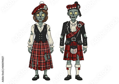 zombie, cartoon, scottish, highland, attire, kilt, plaid, pattern, hat, decaying, skin, vacant, expression, traditional, clothing, couple, undead, monster, halloween, costume, plaid, fabric, red, black, white, grey, green, illustration, vector, design, character, skittish, scarey, horror, fantasy, folklore, culture, beret, vest, jacket, formal, dress, shoe, sock, walking, dead
