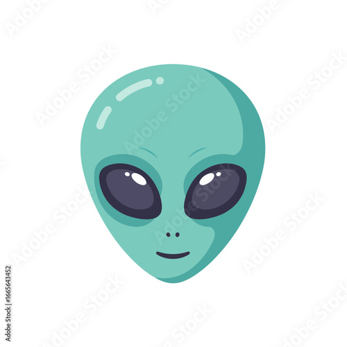 Cartoonish teal alien face with large dark eyes, simple smiling mouth and dotted nose. Concept for sci-fi invitation, space adventure, and otherworldly greeting card design