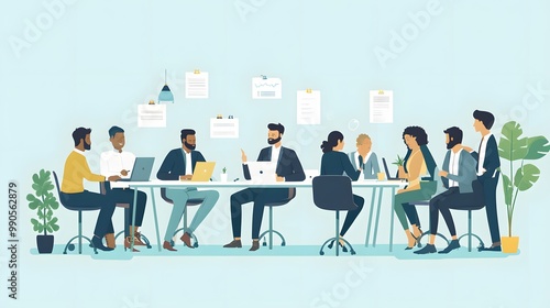 Cartoon-style flat illustration of a group of people working together in an office, sitting at a long table with laptops and papers on it