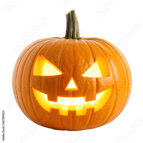 Carved Halloween Pumpkin: A glowing jack-o'-lantern, a classic symbol of Halloween, features a carved face and a warm, inviting light emanating from within. Perfect for seasonal events.