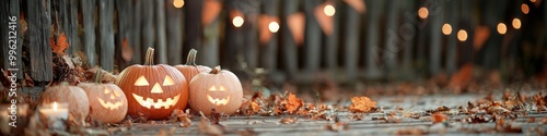 Carved pumpkins with glowing faces in front of a rustic fence, surrounded by autumn leaves and candles, [Halloween banner], [festive and spooky decoration].