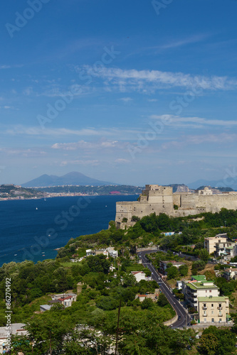 bacoli, tyrrhenian, coast, naples, sea, nobody, aerial, view, boat, summer, blue, sky, vacation, visit, travel, campania, gulf, foreshortening, castle, litoral