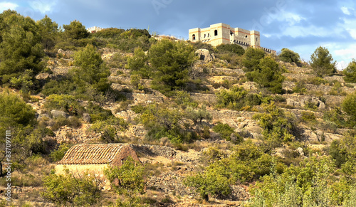 Castle on the mountain. Muslim fortress on a hill and a Spanish village of Camí de Casanya, 12600 Almenara, Castelló, Spain