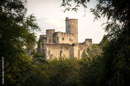 Castle ruins in France featuring a round keep. Evening glow. 2015
