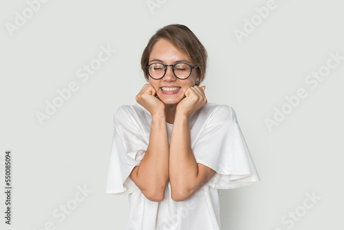 woman, portrait, touching, face, hand, joy, expression, girl, closed eyes, eyeglass, toothy smile, isolated, white, background, happy, young, cosy, dream, fun, lifestyle, model, pretty, smile, laugh, eyewear, shy, specs, beauty, positive, cheerful, fashion, enjoy, sweet, emotion, student, lifestyle, leisure, carefree, confident, relaxed, toothy, joyful, adorable, lovely, closed, natural beauty, trendy, satisfied