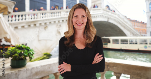 woman, 1, adult, people, person, female, caucasian, white, blond, attractive, beautiful, beauty, portrait, lifestyle, living, holiday maker, travel, trip, vacation, holiday, happiness, smile, joy, cheerful, adventure, leisure, fun, sightseeing, relax, looking, feminine, lady, pose, posing, hair, bright, pretty, laugh, standing, outside, outdoors, city, venice, italy, europa, european, scenic, rialto, bridge
