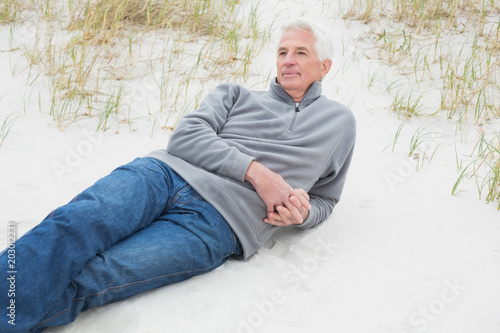 attractive, photogenic, casual attire, leisure, lifestyle, holiday, vacation, beach, winter, cold, jumper, denim, jean, freedom, free, escapism, relaxation, relaxing, calm, peaceful, thoughtful, thinking, daydreaming, shore, sand, reclining, contemplating, grey hair, grass, retired, retirement, pensioner