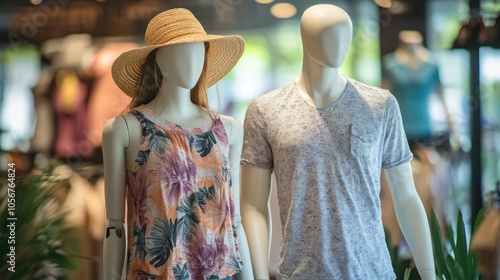 casual attire, summer, clothing, man, woman, mannequin, retail, setting, fashion, display, outfit, style, apparel, garment, trendy, shop, boutique, casual clothes, lightweight, vibrant, colours, accessory, modern, chic, shopping, designer, fabric, comfortable, seasonal, presentation, showcase, activewear, collection, promotion, visual, youth, contemporary, fitting, model, merchandising, clothes rack, loose