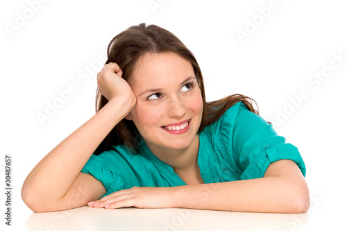 people, young adult, woman, female, beautiful, attractive, smiling, happiness, smile, happy, white background, studio shot, isolated, casual attire, girl, caucasian, positive, toothy, student, sitting, table, leaning, looking up