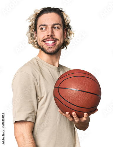 happy, confidence, lovely, happiness, success, joyful, emotion, tenderness, confident, teeth, posing, satisfied, photo, looking, peaceful, cheerful, satisfaction, tender, aside, man, young, caucasian, basketball, player, ball, sport, holding, white, background, portrait, standing, studio, male, game, casual attire, athletic, hobby, play, dripped, shoot, fitness, activity, competition, leisure