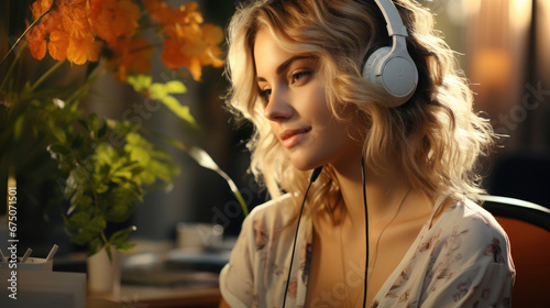 Casual Young Smiling Smart Woman Student In Headphone, Background Image, Hd