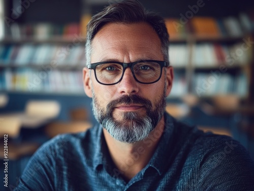 man, bearded, casual attire, attire, eyeglass, library, bookcase, intellectual, academic, study, space, contemplative, pose, indoor, setting, bookshelf, professional, appearance, goggles, modern, male, business, background
