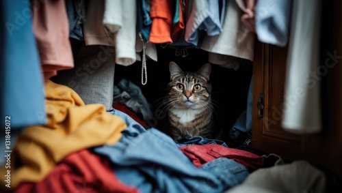 cat concealed in a closet filled with clothes. cat enjoys hide and seek. the cat is positioned in the wardrobe. timid cat