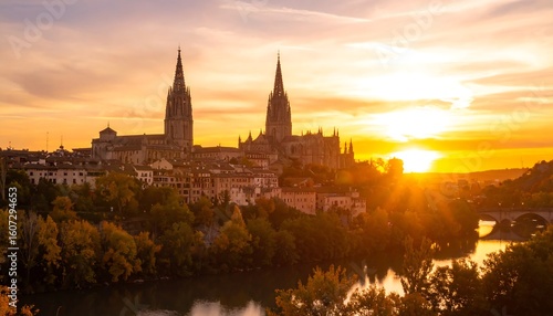 sunset, cathedral, city, river, tree, autumn, gold, light, skyline, building, european, historical, architecture, travel, scenic, view, panorama, golden hour, tranquil, calm, peace, vibrant, horizon, orange, yellow, red, brown, silhouette, nature, landscape, mediaeval, gothic, town, span, europa, city landscape, illuminated, dramatic