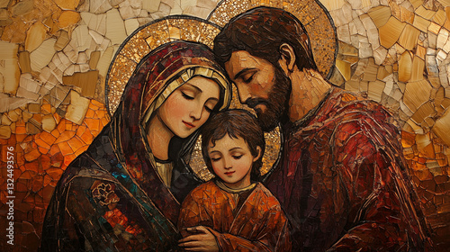 holy, family, mary, joseph, jesus christ, traditional, art, catholic, love, oneness, hugs, religious, divine, colours, texture, mosaic, faith, spirituality, saint, worship, portrait, tenderness, connection, warmth, devotion, heritage, christianity, craftsmanship, symbolism, calmness, serenity, historical, cultural, human relationships, protection, blessing, motherhood, fatherhood, iconography, scenic, artistry, message, prayer, sacred, hope, joy, community, tradition, life