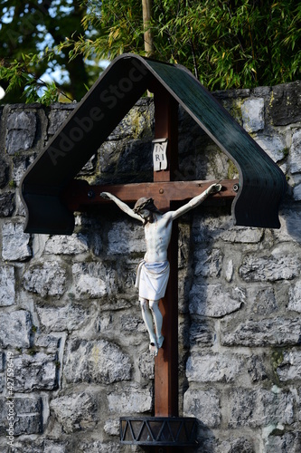 liechtenstein, europa, cross, architecture, old, jesus christ, religion, wall, house, wood, statue, stone, wooden, building, church, sky, crucifix, nature, god, religious, ancient, blue