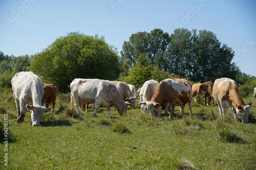 Cattle cows and calves graze in the grass. Cattle breeding free range. Europe Hungary