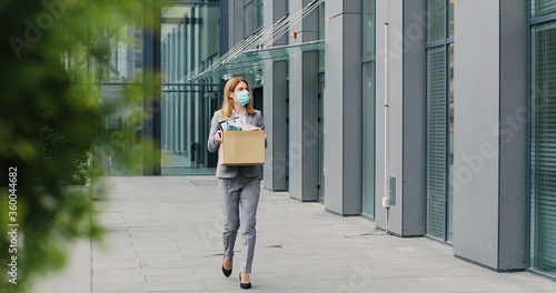 Caucasian businesswoman in medical mask walking outdoors with box of stuff leaving business. Female office worker lost her job. Unemployment rate growing at pandemic. Fired woman coming back home.