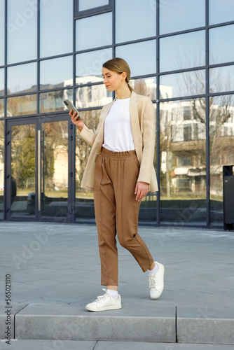 Caucasian busy business woman walking, using smartphone and posing on street. Attractive female typing message near office building during coffee break.