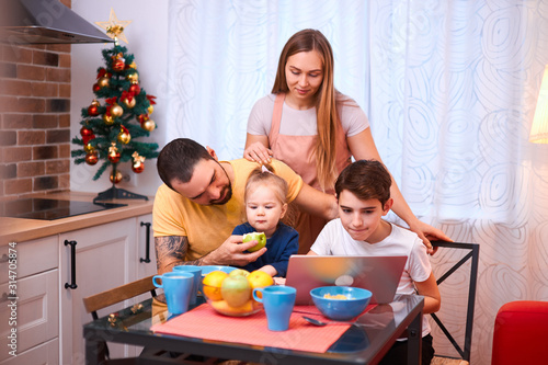 caucasian family at home in casual wear, sit in kitchen together looking at screen of laptop, eating fruits