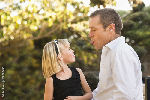 bonding, california, carefree, childhood, color image, copy space, daughter, day, face to face, father, fun, girl, girl, horizontal, man, mature adult, nature, outdoors, people, photo, playful, playing, profile, silly, sticking, sunny, togetherness, tongue, two people, us, waist up, white