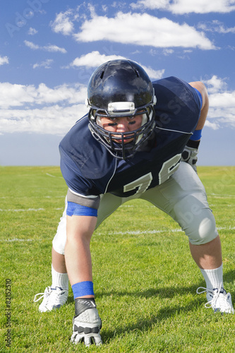 athlete, caucasian, color image, competition, crouching, day, determination, football, football field, football player, front view, full-length, helmet, high school, jersey, lineman, one person, outdoors, people, photo, portrait, posing, protection, ready, safety, serious, sport, sunny, teenage boy, teenage, toughness, uniform, vertical