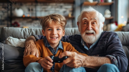 grandfather, grandson, family time, couch, cosiness, generation, fun, entertainment, bonding, technology, relaxation, competition, imagination, pleasure, communication, emotion, hobby, screen, grandmother, rest, relationship, home interior, skill, development, joy
