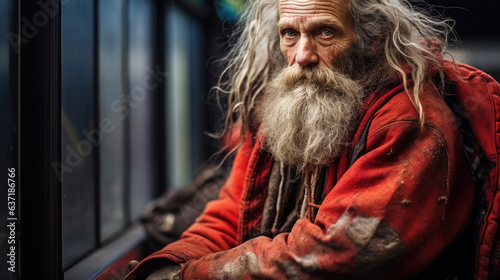 Caucasian Homeless at train terminal. Social crisis, unemployment