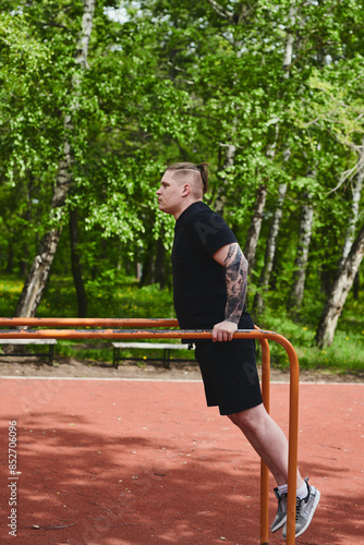Caucasian male athlete doing pull-ups on the horizontal bar outdoors in a summer park