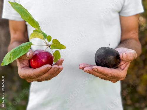 male, apple, red, black, hand, caucasian, fruit, choice, outdoors, holding, comparison, leaf, nature, green, fresh, organic, 2, plant, healthy, garden, juicy, autumn, harvest, ripe, diversity, contrasting, option, picking, seasonal, vibrant, earthy, lifestyle, agriculture, fruit farm, decision, taste, texture, dieting, herbal, wellness, vitamin, nutrient, food