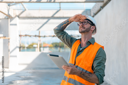 Caucasian Male technician engineer construction worker working in building structure site wearing safety vest and helmet gears, using tablet device technology digital blueprint analyzing planning.