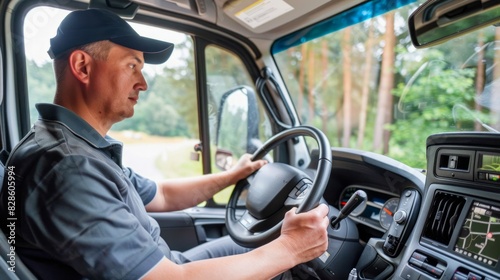 truck, driver, man, male, transportation, logistic, professional, driving, trucking, industry, road, forest, cap, vehicle, cab, steering wheel, journey, travel, transport, highway, semi-truck, delivery, freight, cargo, occupation, job, work, men at work, outdoors, nature, concept, design, seatbelt, dashboard, safety, route, tree, countryside, business, profession, automotive, operator, lorry, commercial, car