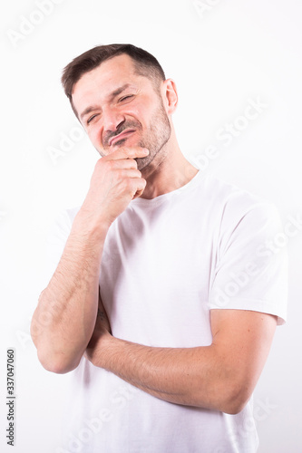Caucasian man appraising looking at camera. Hand on chin. White background