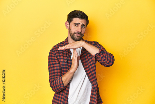 break, out, hand, time, stop, denied, serious, signal, limit, time out, no, concept, half, control, expression, signs, communication, gesture, symbol, pause, caucasian, man, chequered, red, shirt, yellow, studio, background, fashion, casual attire, outfit, style, pattern, male, portrait, dress, cotton, trendy, attire, model, urban, clothing, design, square, textile