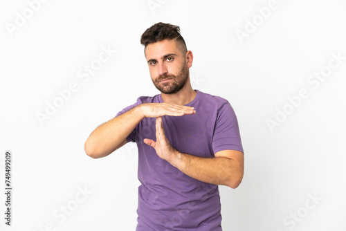 adult, background, blank, casual attire, caucasian, control, defense, gesture, guy, hand, holding, isolated, limit, male, man, no, out, people, person, portrait, pushing, denied, security, serious, signs, signal, slim, studio, time out, white, work, young, man, stop