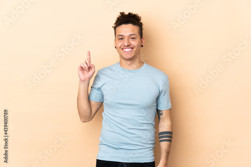 Caucasian man over isolated background showing and lifting a finger in sign of the best