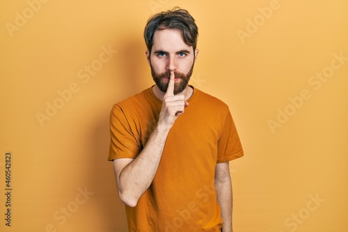 Caucasian man with beard wearing casual yellow t shirt asking to be quiet with finger on lips. silence and secret concept.