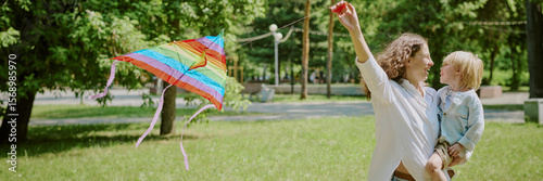 Caucasian middle aged woman holding child while flying colorful kite in green park, both smiling and looking at each other, trees and grass visible in background