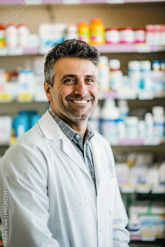 Caucasian pharmacist wearing white lab coat stands in front of pharmacy shelves filled with various medications, conveying sense of approachability, professionalism. High-resolution well-stocked