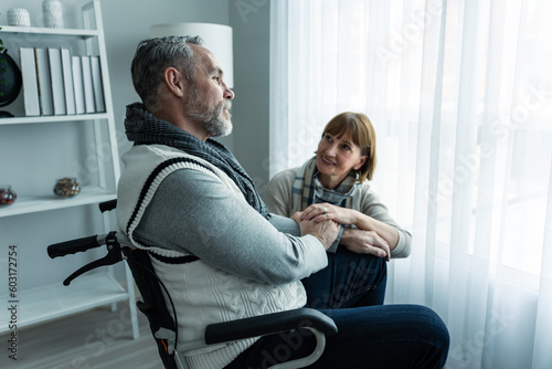Caucasian senior wife support elderly husband sit on wheelchair at home.