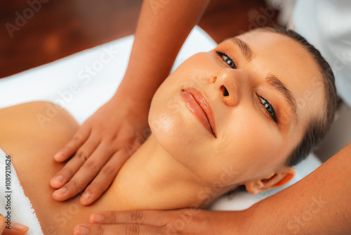 Caucasian woman customer enjoying relaxing anti-stress spa massage and pampering with beauty skin recreation leisure in day light ambient salon spa at luxury resort or hotel. Quiescent